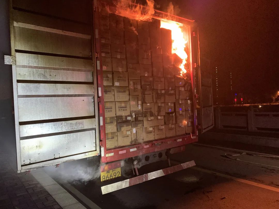 3月4日,湖南省岳阳市。一辆满载辣条的大货车停靠在路边,明火浓烟不时从车内蹿出。